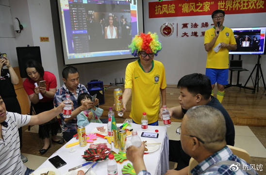 2018年6月22日晚,60余位痛風(fēng)患者及家屬一起歡聚沈陽抗風(fēng)竤中醫(yī)門診二樓多功能廳,和抗風(fēng)竤的醫(yī)生、護士、康復(fù)指導(dǎo)師們,一起度過了個難忘的世界杯之夜。