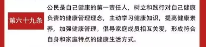 值得一提的是“倡導(dǎo)健康生活方式、倡導(dǎo)健康飲食習(xí)慣、加強(qiáng)健康管理……”等內(nèi)容被寫入法律。《健康法》第六十九條:公民是自己健康的第一責(zé)任人,樹立和踐行對自己健康負(fù)責(zé)的健康管理理念,主動(dòng)學(xué)習(xí)健康知識,提高健康素養(yǎng),加強(qiáng)健康管理。倡導(dǎo)家庭成員相互關(guān)愛,形成符合自身和家庭特點(diǎn)的健康生活方式。