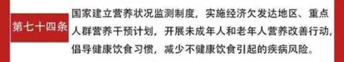 第七十四條:國家建立營養(yǎng)狀況監(jiān)測制度,實(shí)施經(jīng)濟(jì)欠發(fā)達(dá)地區(qū)、重點(diǎn)人群營養(yǎng)干預(yù)計(jì)劃,開展未成年人和老年人營養(yǎng)改善行動(dòng),倡導(dǎo)健康飲食習(xí)慣,減少不健康飲食引起的疾病風(fēng)險(xiǎn)。