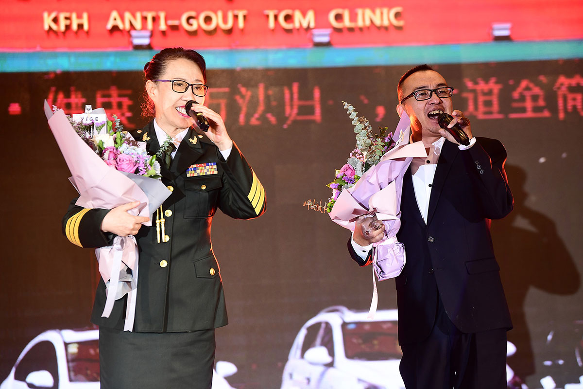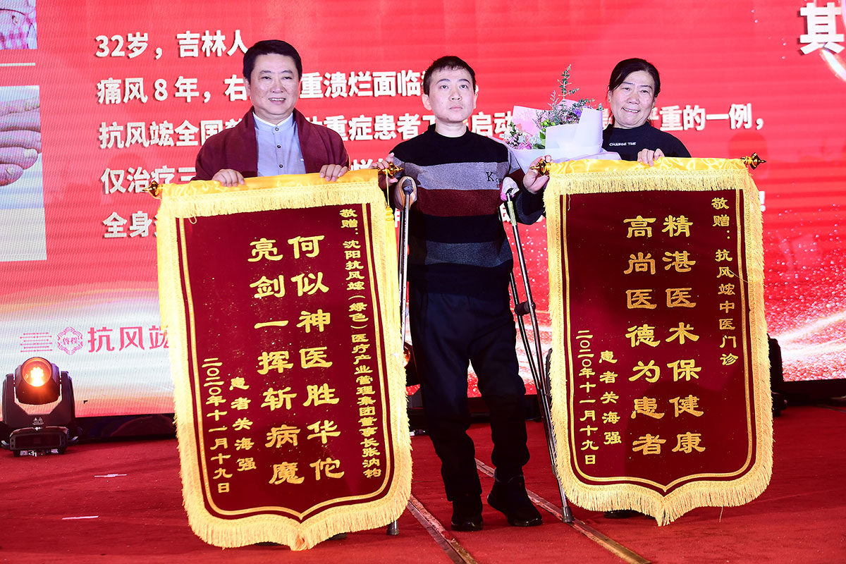 慶典現(xiàn)場最感人的一幕要數(shù)兩位“抗風(fēng)斗士”葛晟杰和關(guān)海強登臺分享一路與痛風(fēng)抗?fàn)幍男穆窔v程。他們都是風(fēng)華正茂,卻備受痛風(fēng)折磨,在遇到抗風(fēng)竤之前,幾乎都瀕臨絕望。來自山東的25歲葛晟杰,痛風(fēng)七年、癱瘓三年,經(jīng)過在抗風(fēng)竤門診的系統(tǒng)治療后,丟掉輪椅和雙拐,自己走上了舞臺;關(guān)海強更是在被多家三甲醫(yī)院診斷“不截肢就有生命危險”,并且還面臨著多臟器衰竭的風(fēng)險,抗風(fēng)竤醫(yī)療集團張汭鈞董事長冒著極大的風(fēng)險,向他伸出救助之手。如今的關(guān)海強不僅恢復(fù)了生命活力,而且還走上舞臺為大家吉他彈唱,重獲新生的他最想感激的就是張汭鈞董事長、程莉琂總裁以及全體抗風(fēng)竤人給了他重獲健康的希望!