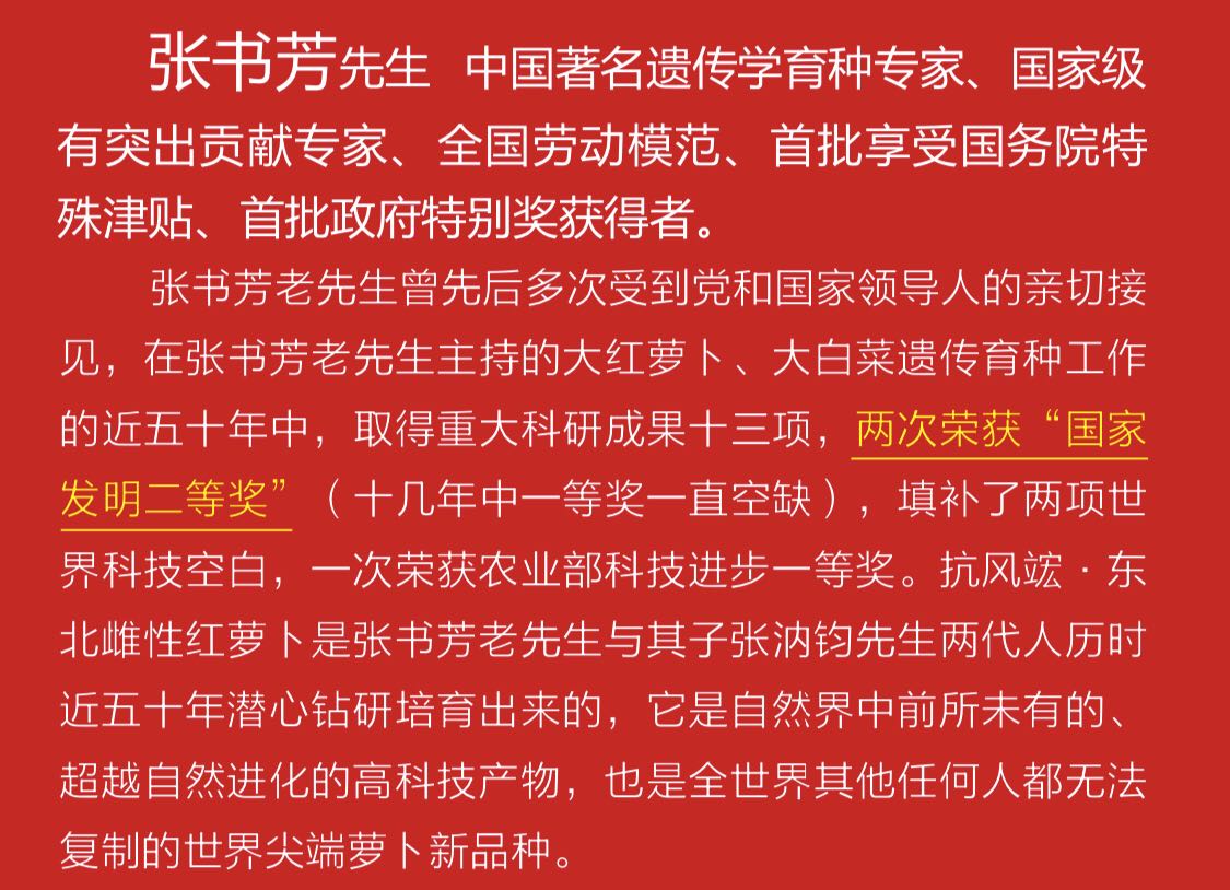 回首過往,“抗風(fēng)竤”對(duì)“雌性紅萊菔暨雌性紅蘿卜”在醫(yī)療應(yīng)用領(lǐng)域的研究、探索充滿艱辛。“雌性紅蘿卜”為我國著名遺傳學(xué)育種專家張書芳先生應(yīng)用雄性不育系育種技術(shù)選育,嘔心瀝血培育而成,該項(xiàng)技術(shù)是國家“七五、八五攻關(guān)”重點(diǎn)科研項(xiàng)目,并榮獲“國家發(fā)明二等獎(jiǎng)”(一等獎(jiǎng)空缺)。
