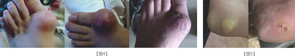 接受抗風(fēng)竤治療的部分痛風(fēng)患者在出現(xiàn)紅、腫、熱、痛、發(fā)燒等無(wú)菌性炎癥反應(yīng)之后,痛風(fēng)石隨之會(huì)出現(xiàn)明顯變軟、縮小的情,部分患者出現(xiàn)痛風(fēng)石表皮積液甚至尿酸鹽從腳部和手部直接排出的現(xiàn)象【見(jiàn)圖4、圖5】。還有一種情況,某些患者關(guān)節(jié)四肢表面原本沒(méi)有痛風(fēng)石,接受抗風(fēng)竤治療 后卻在腳背或者手背鼓起軟包。這是由于關(guān)節(jié)腔內(nèi)的尿酸鹽結(jié)晶快速溶解但未能及時(shí)排出引起的,堅(jiān)持治療幾天后就會(huì)代謝排出體外,不必?fù)?dān)心。
